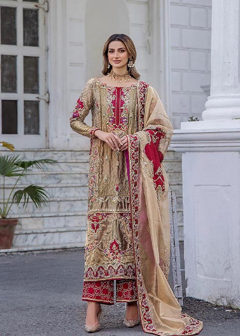 Indulge in a regal affair of hues with this champagne and crimson ensemble. The long straight shirt is a festoon of curated embroidery and embellishments, harmoniously paired with maroon embellished trousers and a festive dupatta, creating an opulentl look.